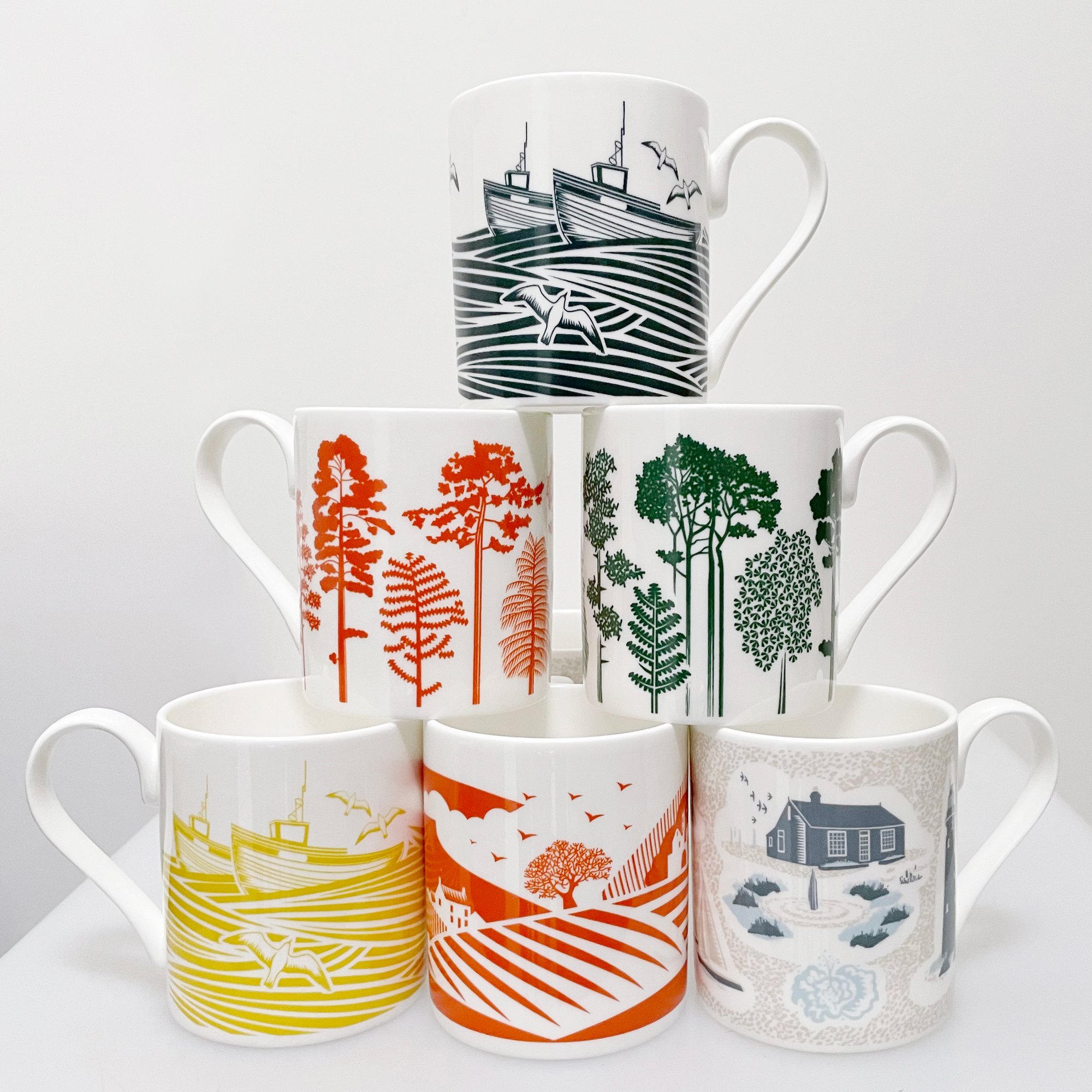 Our Dungeness bone china mug features a mass of shingle, punctuated by illustrated vignettes of quaint cabins, abandoned fishing boats, ramshackle huts and one of the lighthouses, which towers over the Mini Moderns beach house.