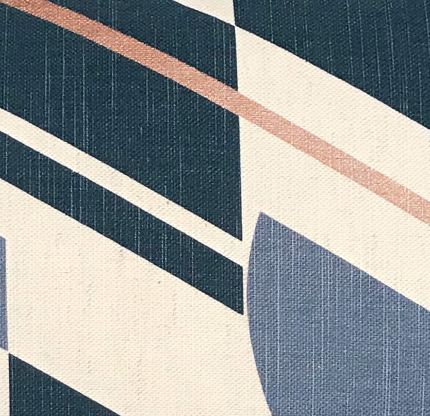 The pipeline is represented by a continuous copper line, running diagonally across a background inspired by 'dazzle' camouflage featured on military vessels during the two world wars in our signature Washed Denim colourway.