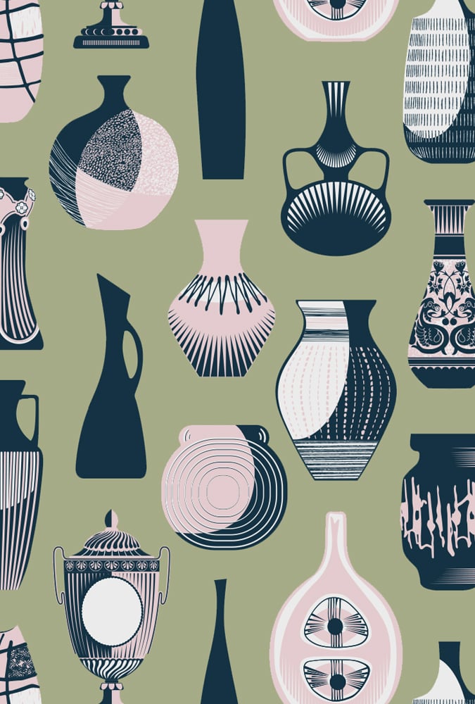An eclectic array of vases and jugs adorns this wallpaper, inspired by the Geffrye’s diverse ceramics collection.